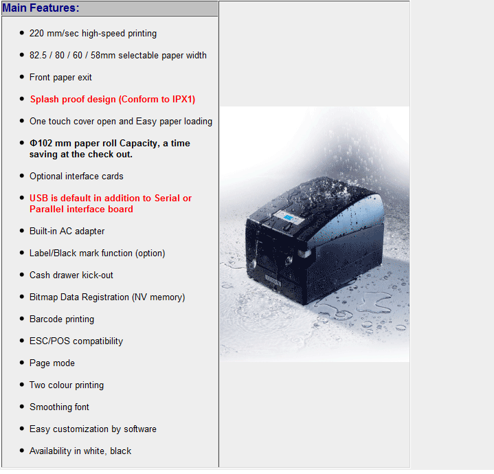 FEATURESHigh Speed (100mm/sec) Direct Thermal PrintingDrop in Paper loadingTwo Colour Printing (with Special Paper)Barcode PrintingCompatibility = EPSON (ESC/POS)Easy to use configuration softwareNV Memory for Bit map Data StoragePage mode printingLow cost Thermal PrintingUser-changeable interfaceFlexible paper widths. (80mm & 58mm)