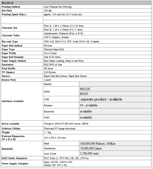 Samsung / Sam4s Ellix-20 80mm Thermal Receipt Printer - USBThe SAM4S ELLIX-20 is a very fast Thermal Docket Printer that fits perfectly with POS Systems and Cash Registers alike. It is high speed and has drop in Paper loading. Suitable for a large range of Retail and Hospitality POS Applications.