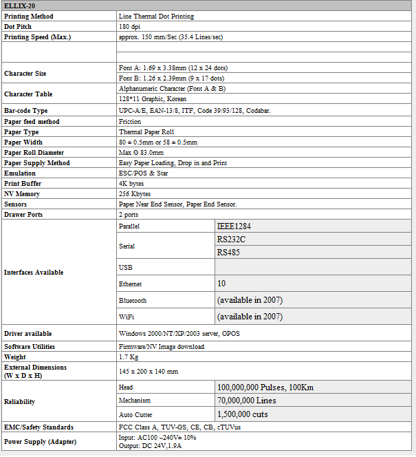 Cost Effective SAMSUNG Thermal Line Printer. Max speed 75mm/sec. 80mm thermal paper. Auto paper loading. Vertical mounting if required. Auto paper cutter. NV bit map memory. 8K buffer. Cash drawer kick out. ESC/POS (EPSON) emulation. External Power supply included. Interface cable included.